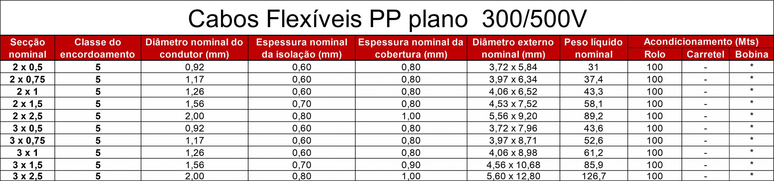 Abaixo temos a tabela com os dados construtivos do Cabo Flexível PP Plano 300/500 – 300/300v: