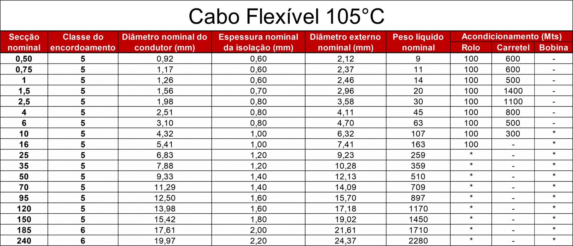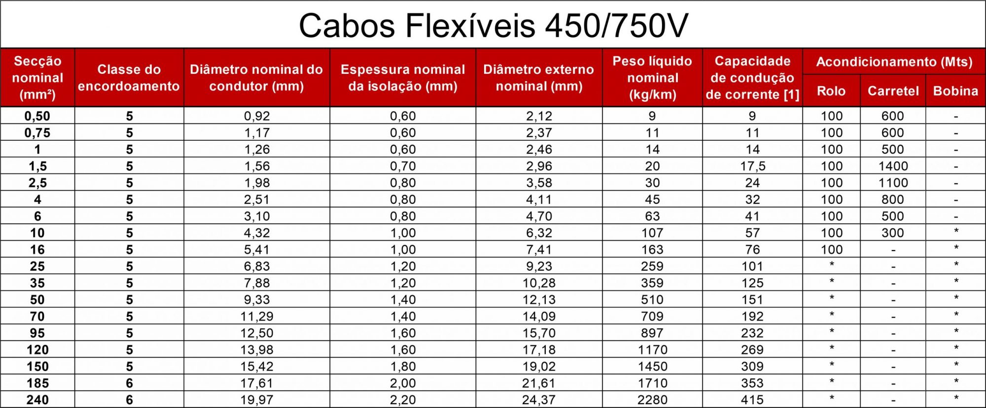 Abaixo temos a tabela de Cabo Flexível 750V com os dados construtivos: