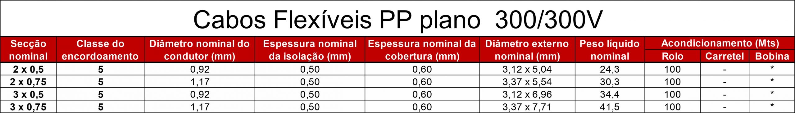 Abaixo temos a tabela com os dados construtivos do Cabo Flexível PP Plano 300/500 – 300/300v: